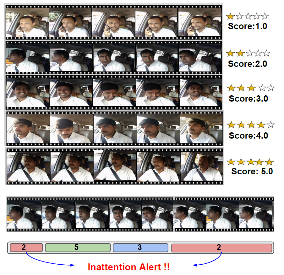 Driver inattentiveness, whether due to fatigue or distraction, is a leading cause of road accidents. Prior work has evaluated fatigue and distraction independently. In AutoRate, we leverage the front camera of a windshield-mounted smartphone to monitor the driver’s attentiveness holistically. AutoRate derives a driver’s attention rating by fusing several spatio-temporal features pertaining to the driver’s state and actions, including head pose, eye gaze, eye closure, yawns, use of mobile phone, etc. Our analysis shows that AutoRate’s automatically generated rating has an overall agreement of 0.87 with the ratings provided by human annotators.